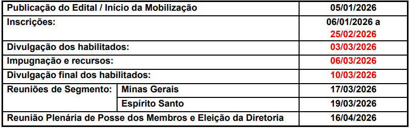 A fase final será a Reunião Plenária de Posse dos membros eleitos e a eleição da nova diretoria, prevista para 16 de abril de 2026, em local a ser definido.